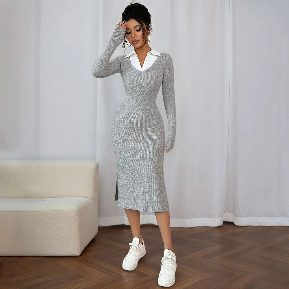 Korean-style relaxed-fit shirt-collar knit dress with patchwork detailing Women's autumn/winter slim-fit long-sleeve dress in light gray